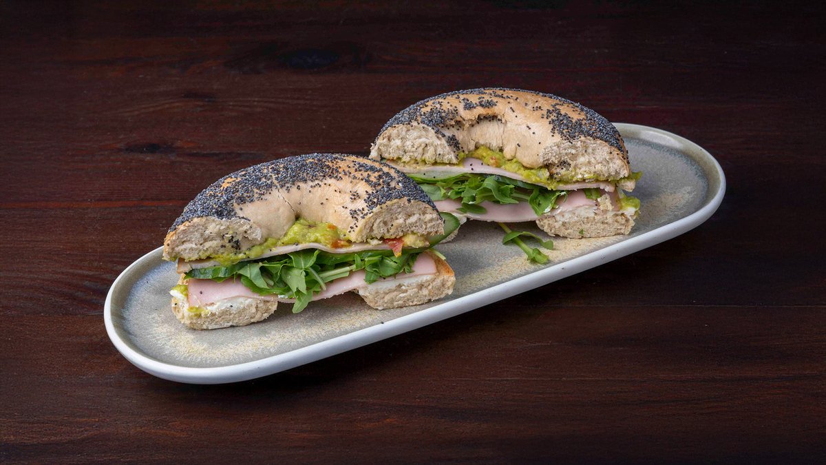 Φρεσκοψημένο bagel με καπνιστή γαλοπούλα, τυρί κρέμα & ντομάτα