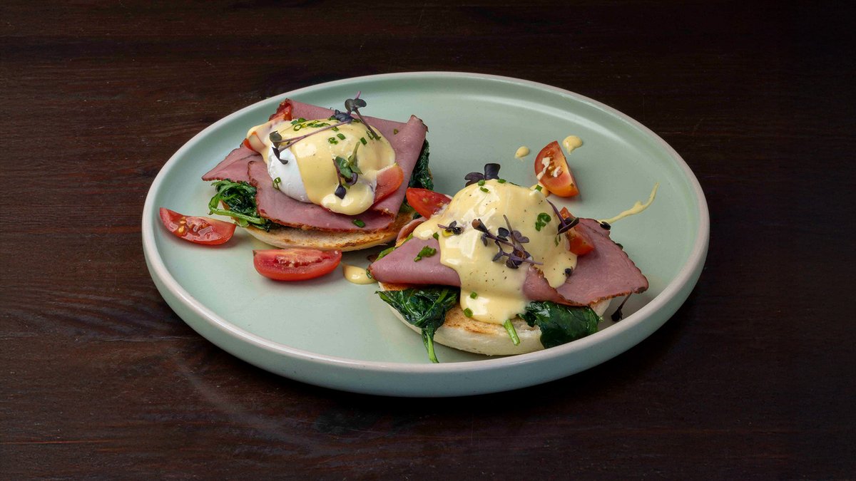 Αυγά ποσέ πάνω σε English muffin, σπανάκι σωτέ, παστράμι sauce hollandaise με τρούφα & ντοματίνια