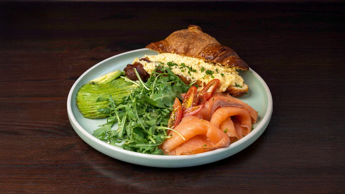 Κρουασάν βουτύρου γεμιστό με scrambled eggs, τυρί γκούντα και συνοδεύεται με ντοματίνια, καπνιστό σολομό, ρόκα & αβοκάντο