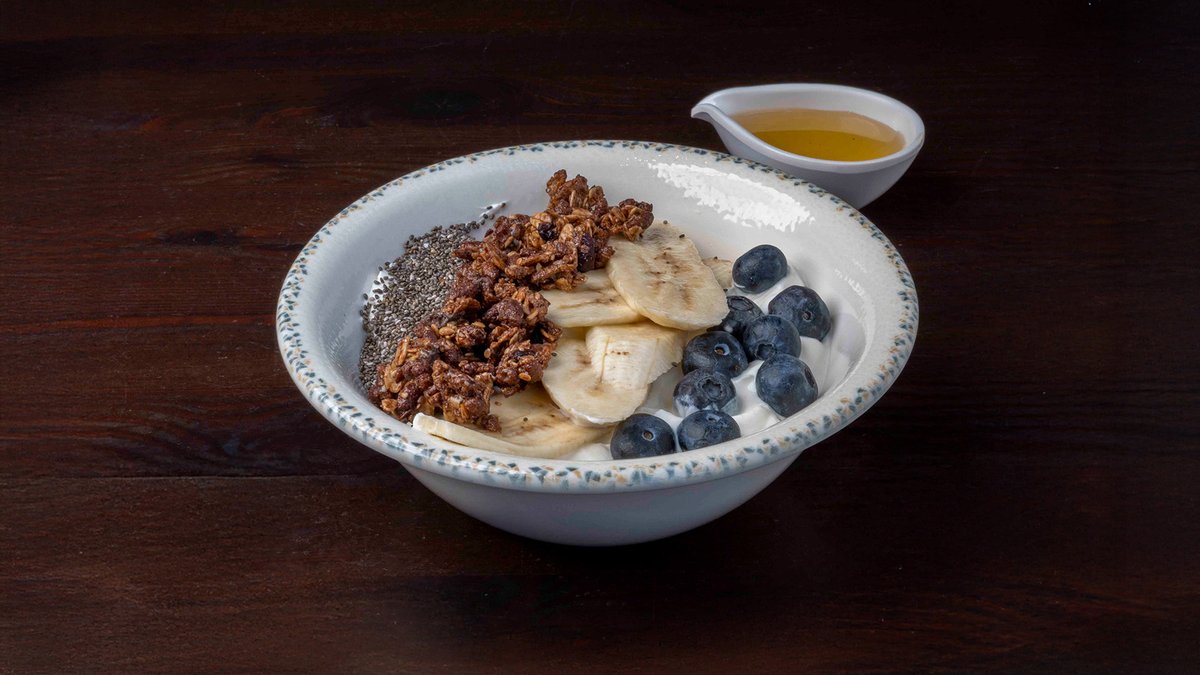 Γιαούρτι 2%, χειροποίητο muesli, σπόροι chia, μπανάνα, μύρτιλα & μέλι