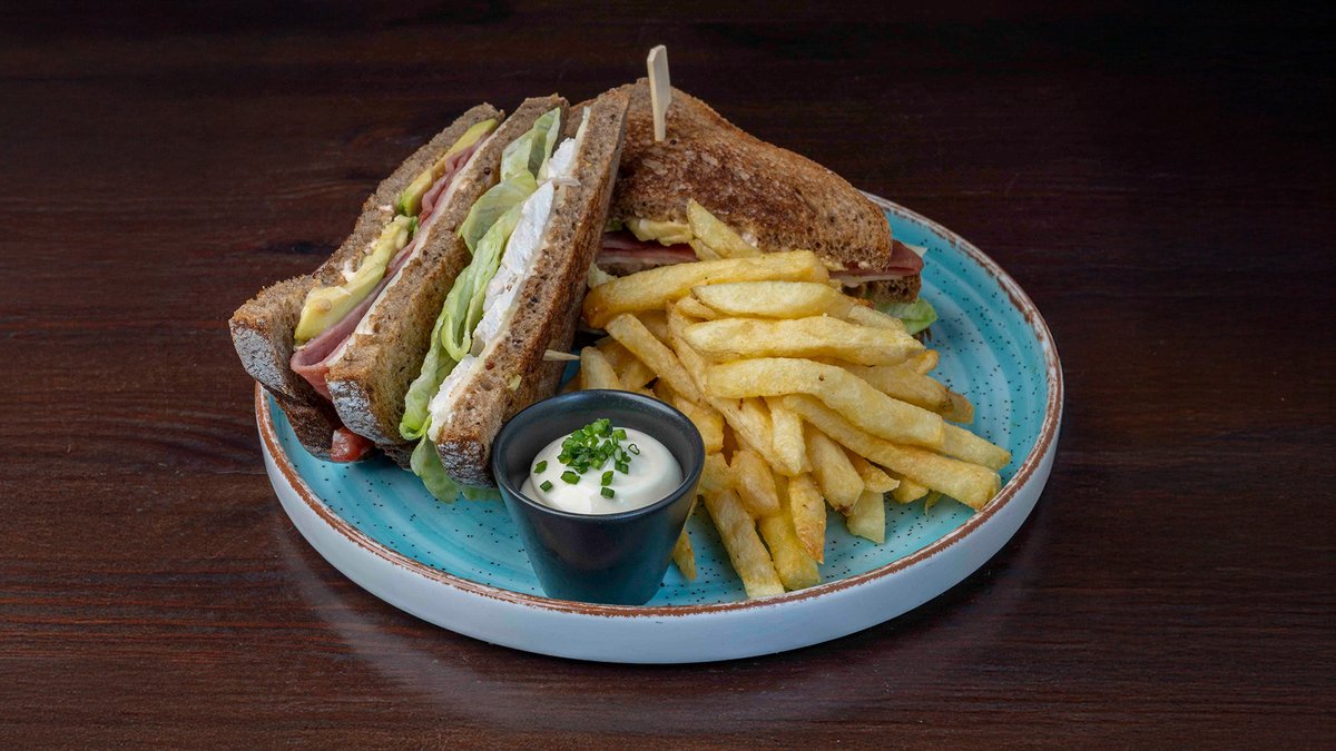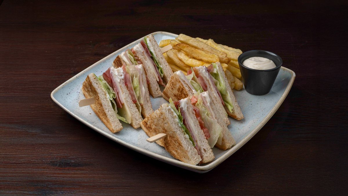 Με καπνιστή γαλοπούλα, τυρί, bacon, ντομάτα, iceberg & μαγιονέζα . Συνοδεύεται από φρέσκες τηγανητές πατάτες.