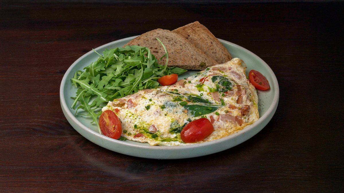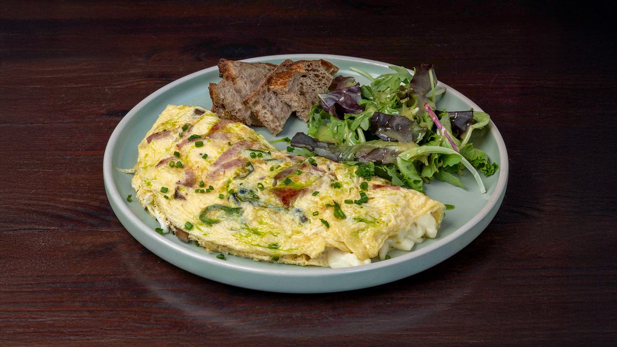 Mε τρία αυγά, mozzarella, bacon, μανιτάρια, πράσινη πιπεριά, σχοινόπρασο & αρωματικό λάδι. Συνοδεύεται με φρυγανισμένο ψωμάκι ολικής & σαλάτα