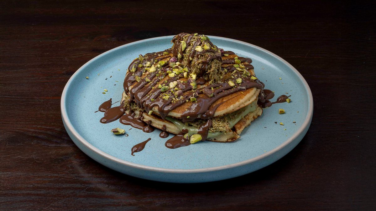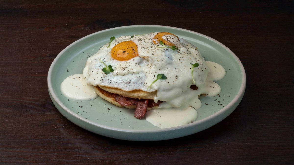 2 Pancakes, 2 τηγανητά αυγά, bacon, maple syrup & mousse Mετσοβόνε
