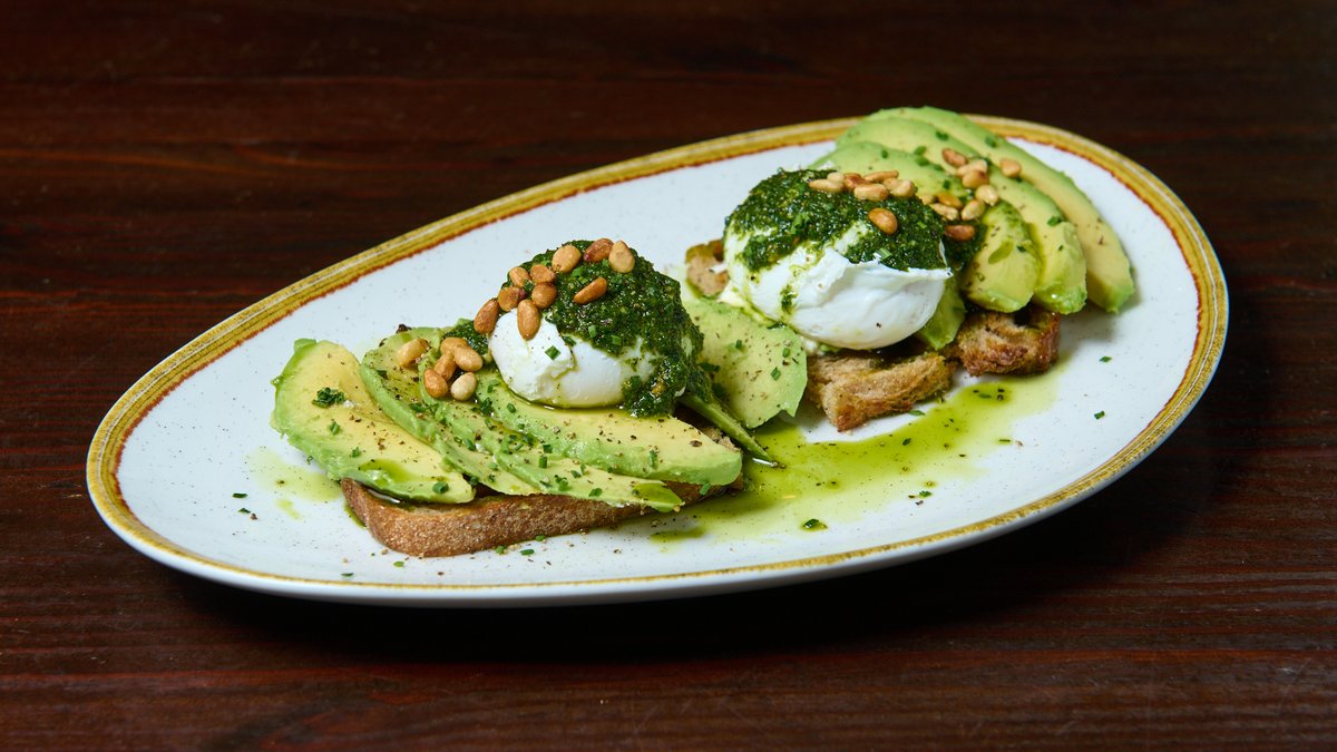 Προζυμένιο ψωμί, αυγά ποσέ, τυρί κρέμα, αβοκάντο, πέστο βασιλικού & κουκουνάρι. Ο σολομός δεν περιλαμβάνεται, προστίθεται προαιρετικά με έξτρα χρέωση.