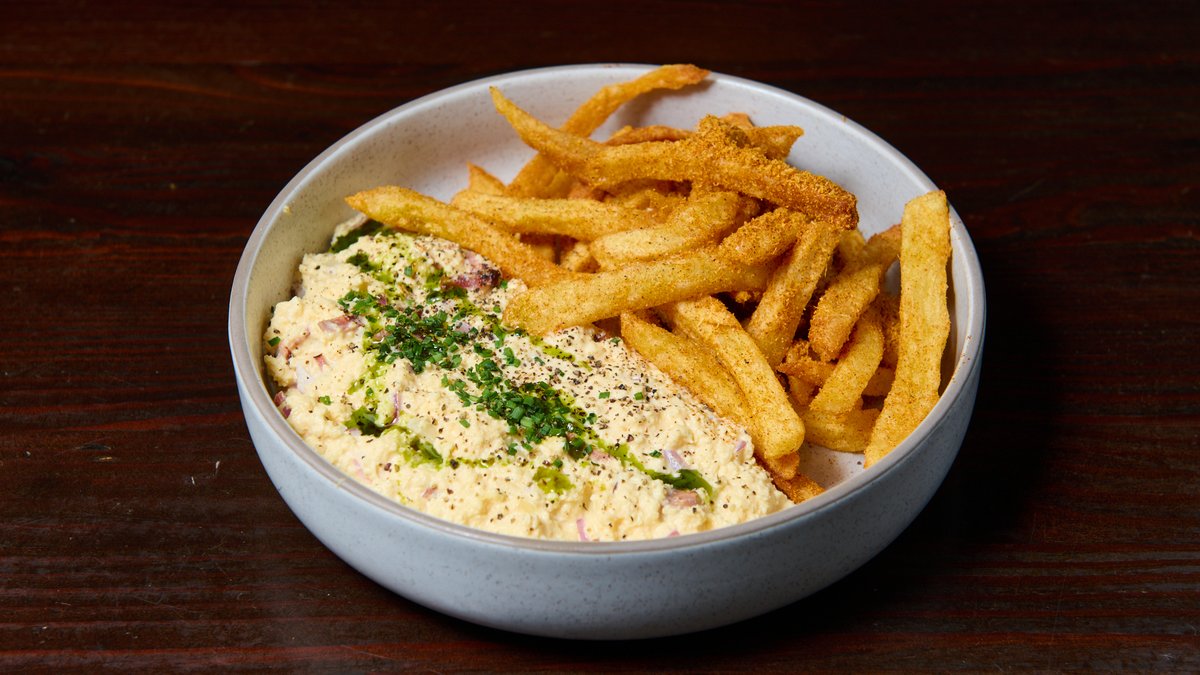 Ψωμάκι milkbread, Ceasar’s sauce, κοτόπουλο πανέ, 2 τηγανητά αυγά, sauce hollandaise & σχοινόπρασο