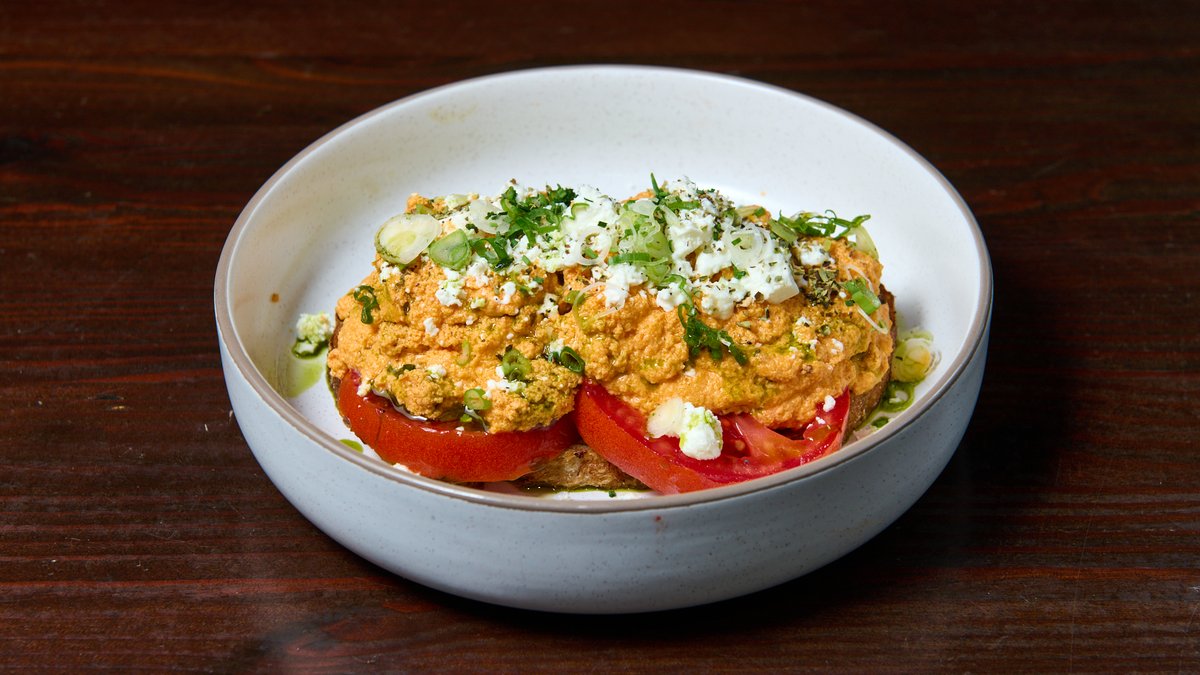 Χτυπητά αυγά με ντομάτα, πάνω σε προζυμένιο ψωμάκι, φέτα, ρίγανι, φρέσκο κρεμμύδι & αρωματικό λάδι. Το λουκάνικο & οι πατάτες δεν περιλαμβάνονται, προστίθενται προαιρετικά με έξτρα χρέωση.