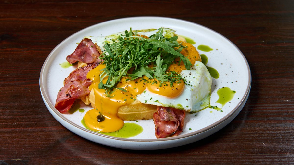 Τραγανή βάφλα, cheddar sauce, 2 αυγά μάτια, bacon & ρόκα