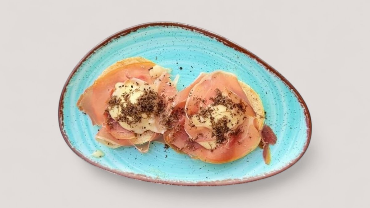 Αυγά ποσέ με prosciutto crudo, τρούφα φρέσκια & σάλτσα παρμεζάνας πάνω σε english muffin