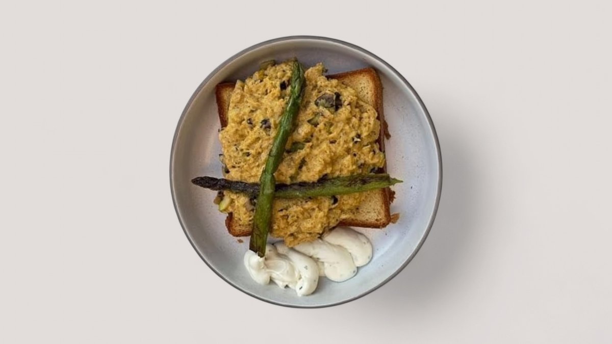 Αυγά scrambled με μανιτάρια και κολοκυθάκι πάνω σε milk bread, σπαράγγια σωτέ & αρωματική κρέμα τυριών
