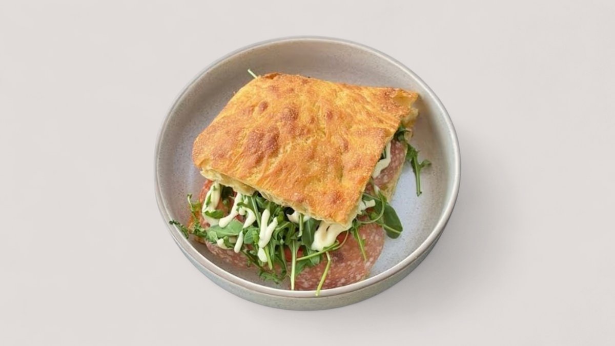 Ζεστό sandwich με σαλάμι Μιλάνου, τυρί camembert, ντομάτα, ρόκα & μαγιονέζα τρούφας