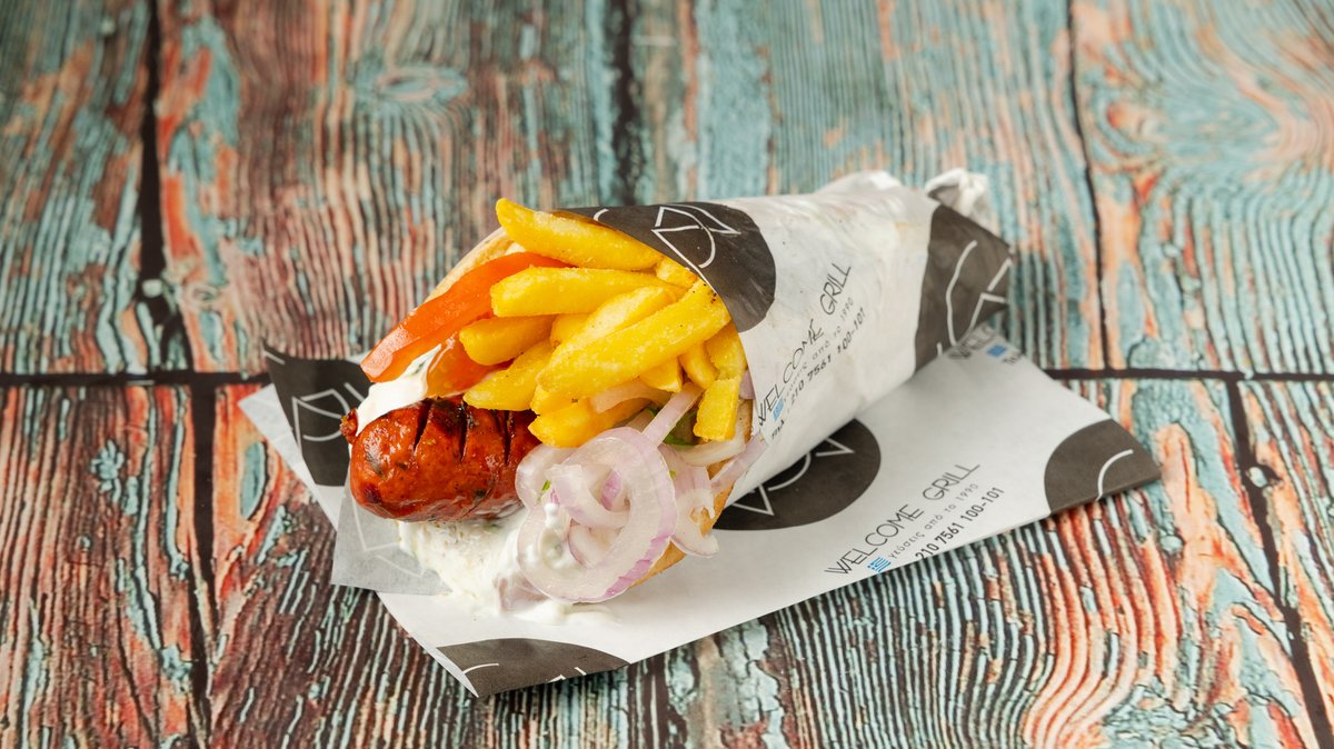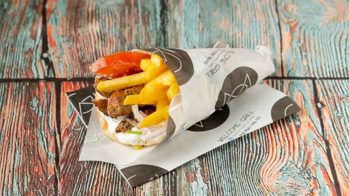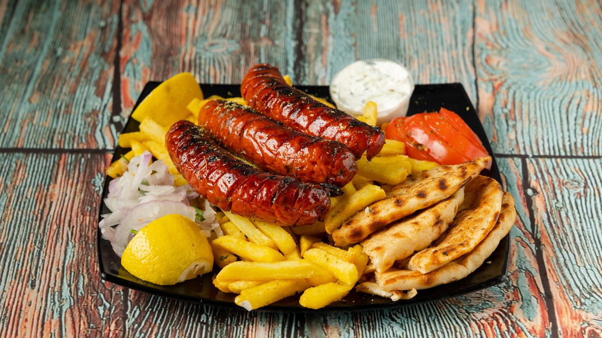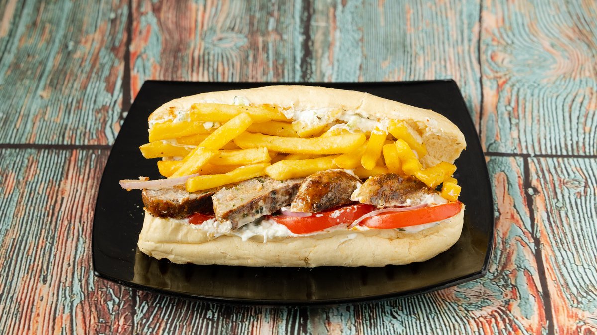 Συνοδεύεται από πατάτες τηγανητές, ντομάτα, κρεμμύδι και τζατζίκι
