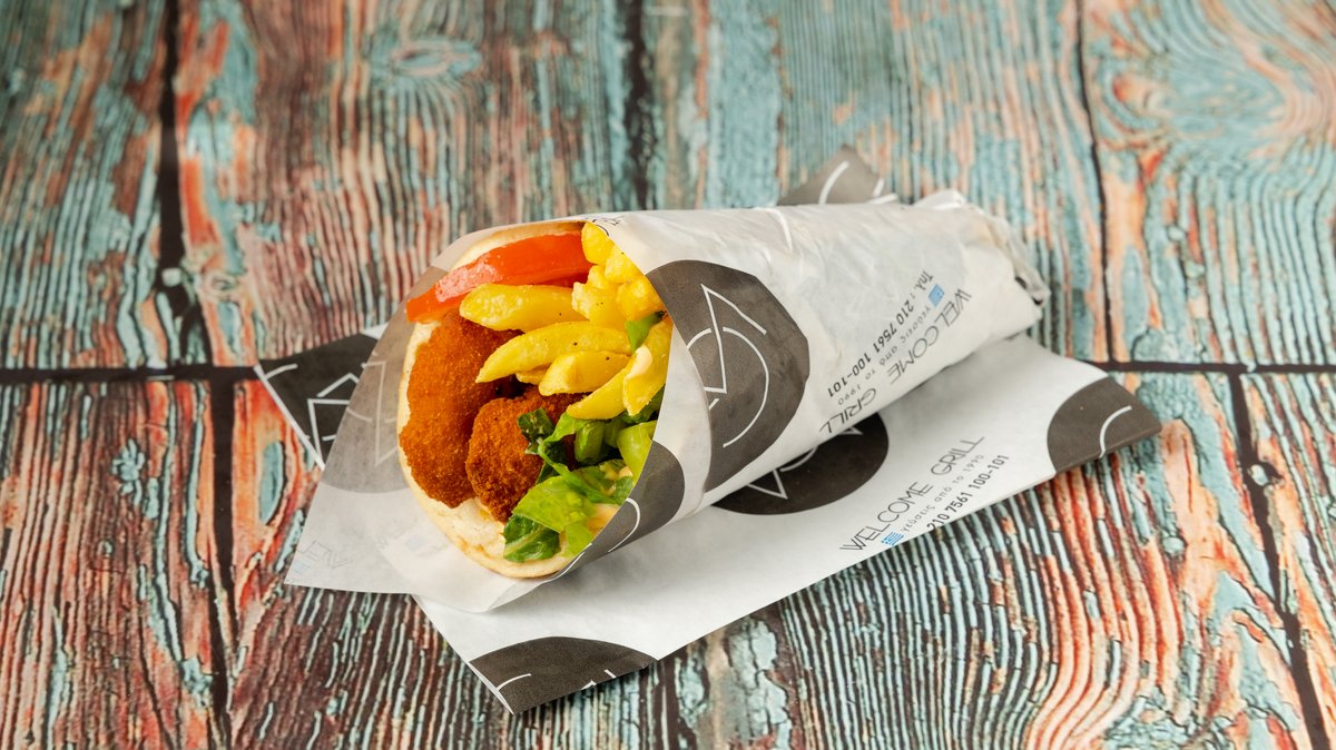 Σνίτσελ κοτόπουλο, ντομάτα, μαρούλι, μαγιονέζα, κέτσαπ, μουστάρδα. Συνοδεύεται με πατάτες