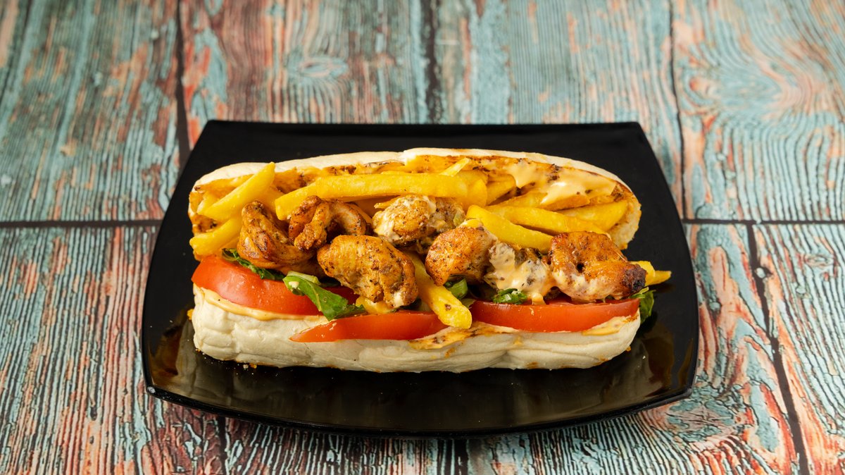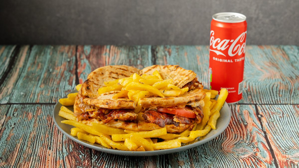 Mε μπιφτέκι κοτόπουλο, ντομάτα, κρεμμύδι, μαγιονέζα, κέτσαπ, μουστάρδα. Συνοδεύεται από πατάτες, αναψυκτικό 0.33 l