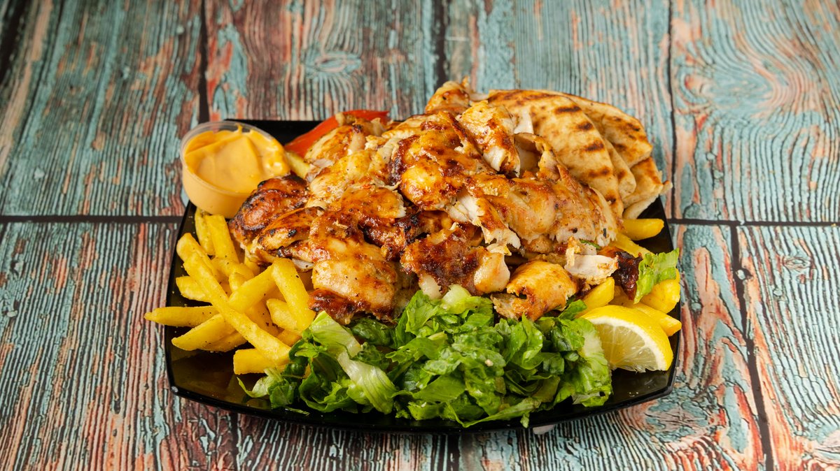 8 τεμάχια. Συνοδεύεται από πατάτες τηγανητές. 2 πίτες, ντομάτα και χούμους