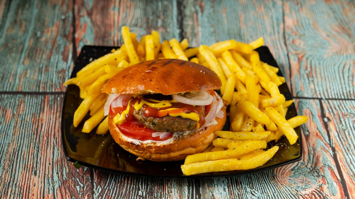 Mε μπιφτέκι μοσχάρι, ντομάτα, κρεμμύδι, μαγιονέζα, κέτσαπ, μουστάρδα. Συνοδεύεται από πατάτες, αναψυκτικό 0.33 l