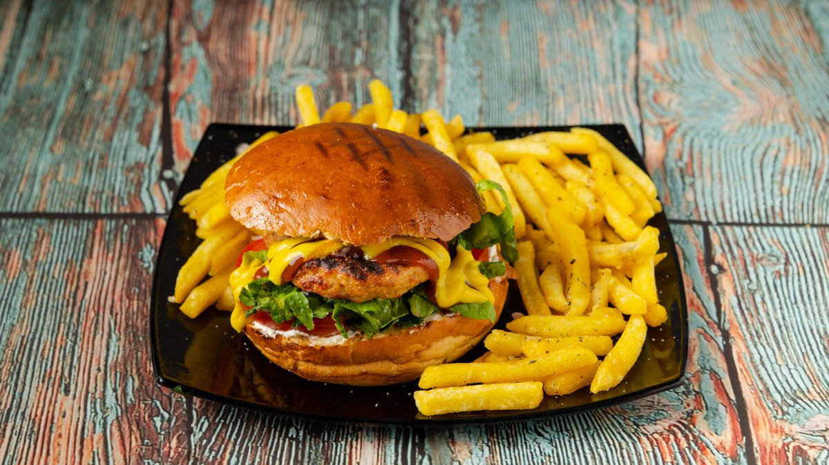 Μπιφτέκι κοτόπουλο, ντομάτα, κρεμμύδι, μαγιονέζα, κέτσαπ, μουστάρδα. Συνοδεύεται με πατάτες