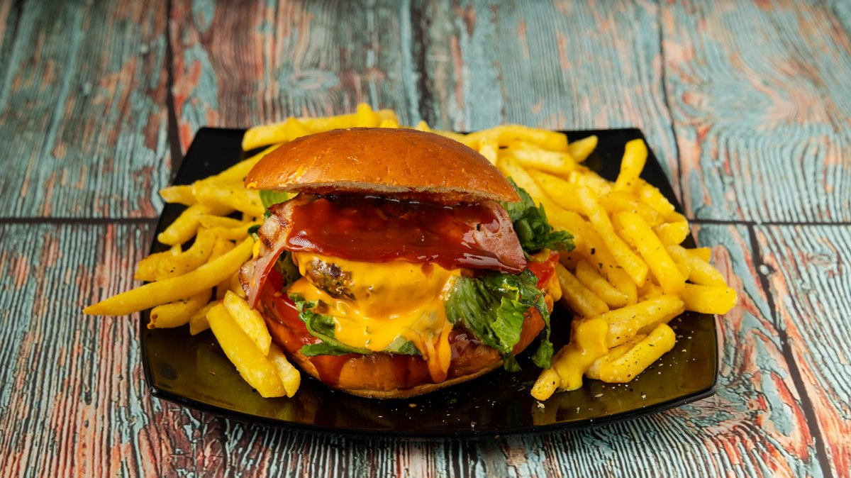 2 Μπιφτέκiα μοσχαρίσια, ντομάτα, μαρούλι, μπέικον, τσένταρ, σως BBQ. Συνοδεύεται με πατάτες