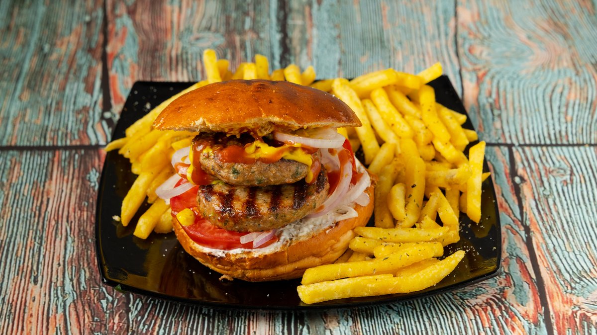 2 Μπιφτέκια μοσχαρίσια, ντομάτα, κρεμμύδι, μαγιονέζα, κέτσαπ, μουστάρδα. Συνοδεύεται με πατάτες