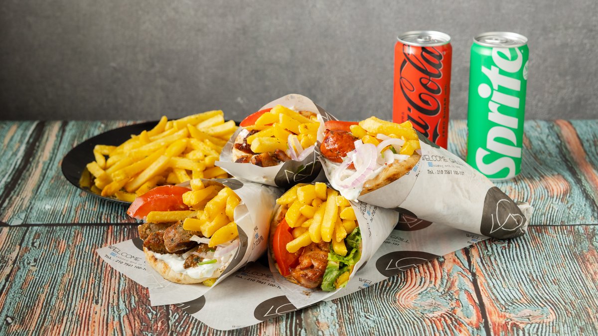 3 Τεμάχια + 2 Τυλιχτά + 1 Πατάτες Τηγανητές + 2 Αναψυκτικά 0.33 l