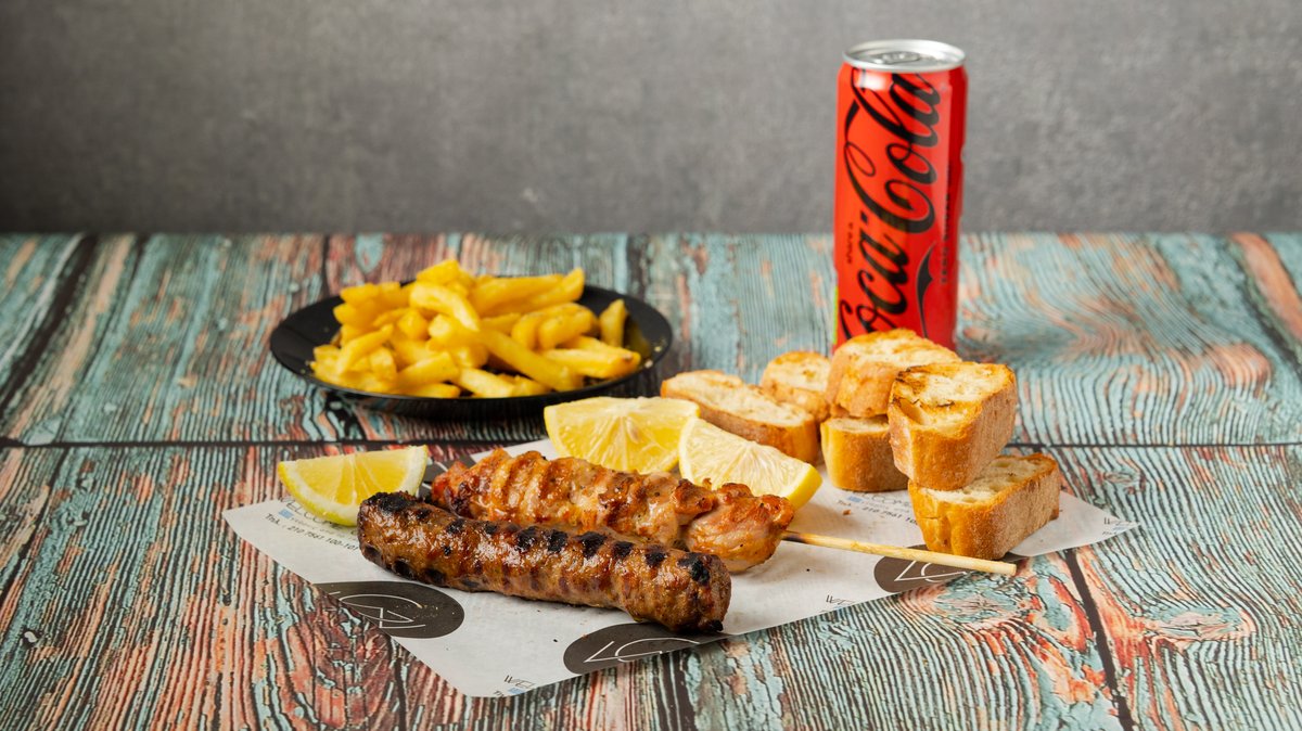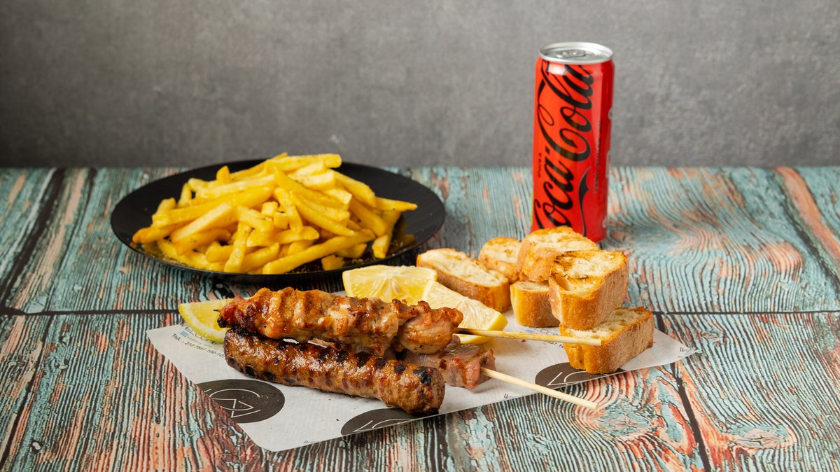 Με καλαμάκι χοιρινό, καλαμάκι κοτόπουλο, μπιφτέκι μοσχαρίσιο, πίτα, πατάτες, ντομάτα, τζατζίκι ή σως