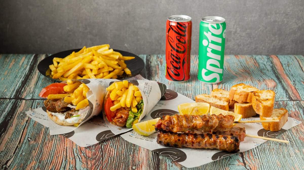 Με γύρο χοιρινό, γύρο κοτόπουλο, καλαμάκι χοιρινό, μπιφτέκι μοσχαρίσιο, λουκάνικο. Συνοδεύεται από 2 πίτες, πατάτες, ντομάτα, τζατζίκι και σως