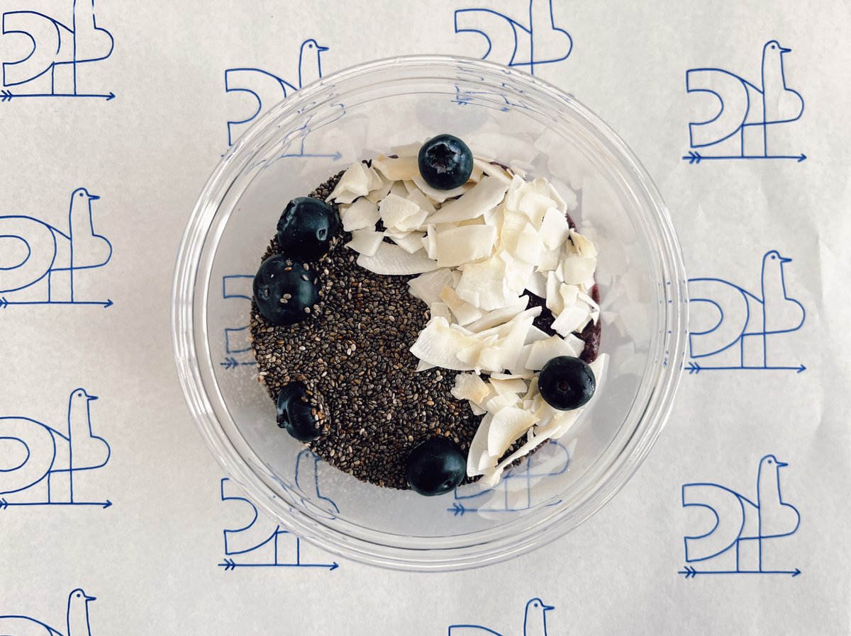 Blueberry, μπανάνα, maple syrup, chia seeds , flakes καρυδας και γάλα σόγιας