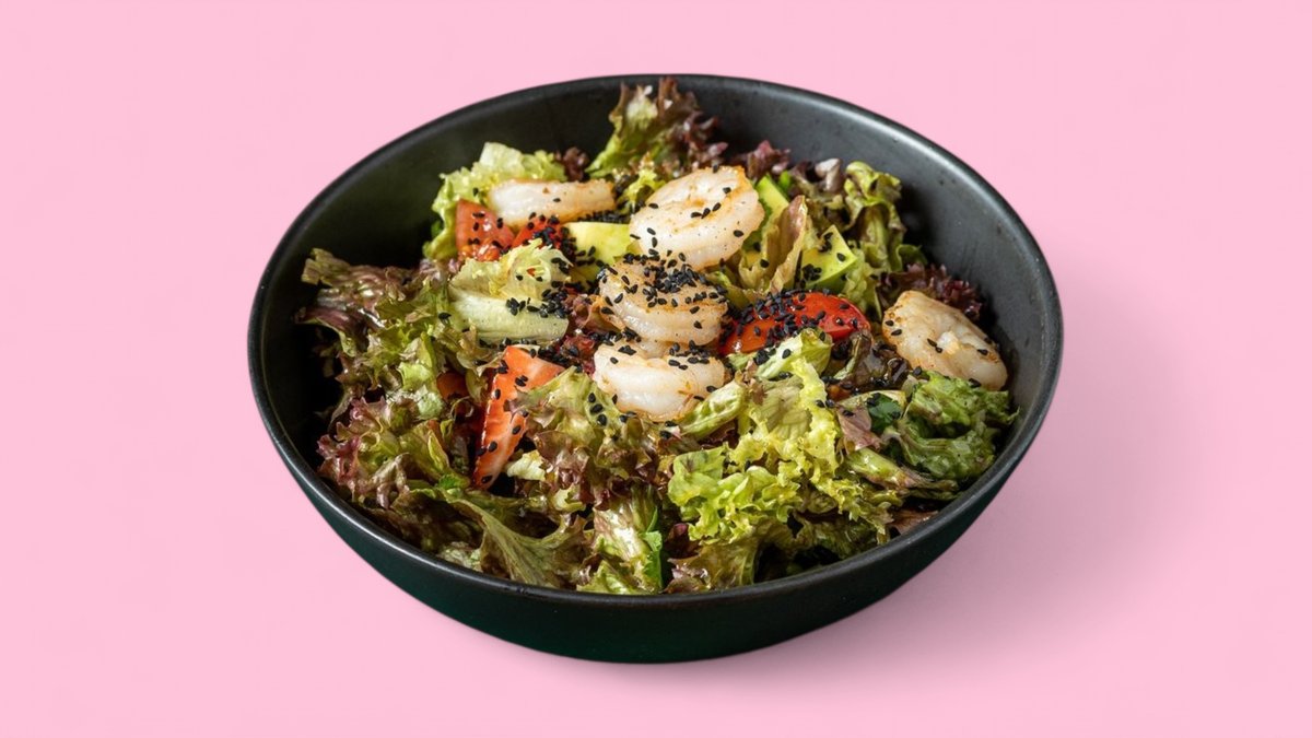Σαλάτα με λόλα, γαρίδες, κόλιανδρο, ντοματίνια, σουσάμι, φράουλες, αβοκάντο και γλυκιά sauce