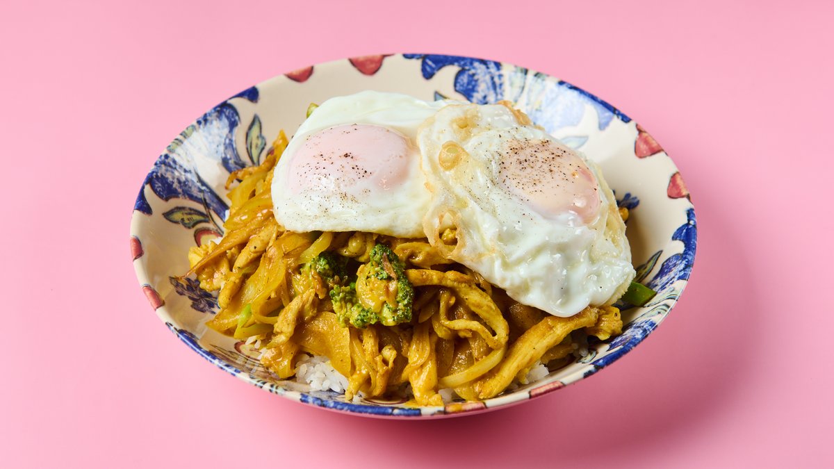 Ρύζι ατμού, διπλό φιλέτο κοτόπουλο, κρεμμύδι, μπρόκολο, μανιτάρια πλευρώτους, δύο τηγανητά αυγά και yellow curry sause