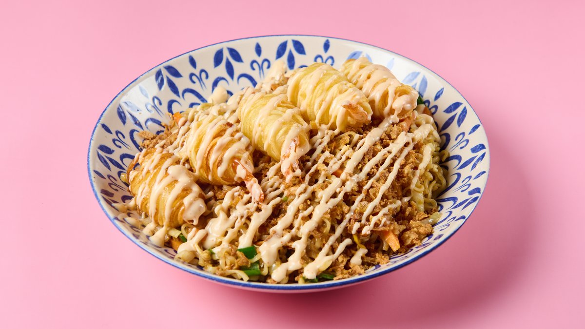 Μακαρόνια μentake , φρέσκο κρεμμύδι , λάχανο, καρότο, αυγό, τραγανό κρεμμύδι, πέντε γαρίδες τυλιγμένες με noodles πατάτας, chili mayo sauce