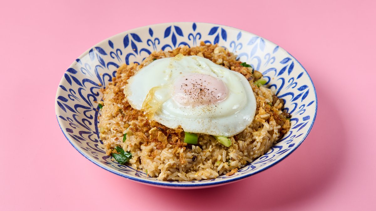 Khao pad. Με κοτόπουλο, ρύζι γιασεμί, κρεμμύδι, ντοματίνια, φρέσκο κρεμμύδι, καρότο και αυγό