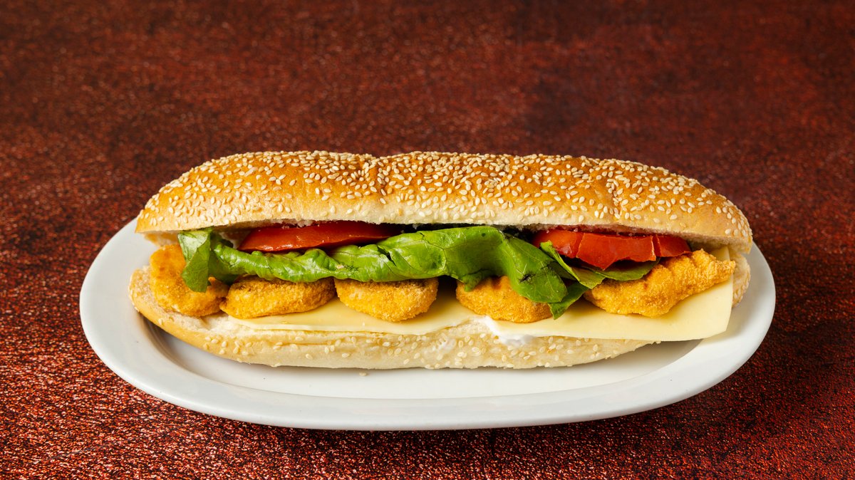 Ψωμί σουσαμένιο με κοτομπουκιές, gouda, ντομάτα, μαρούλι και μαγιονέζα