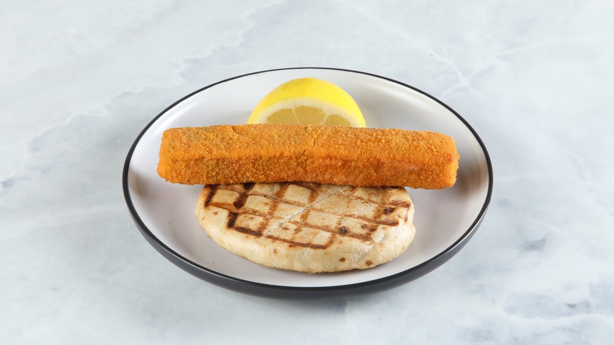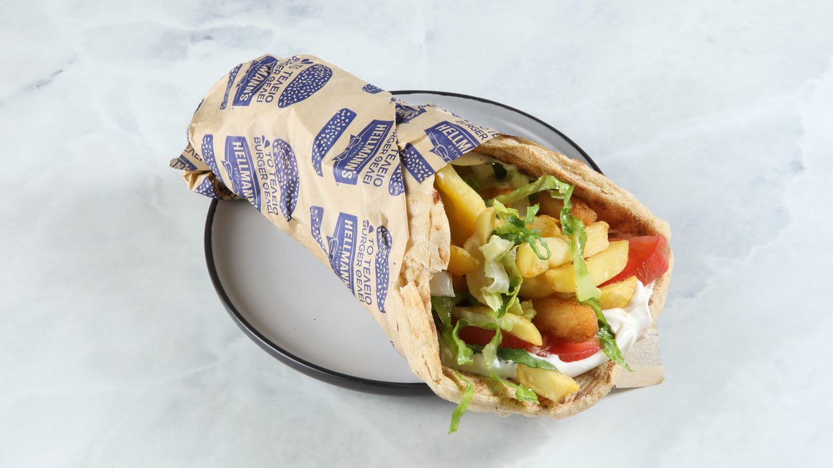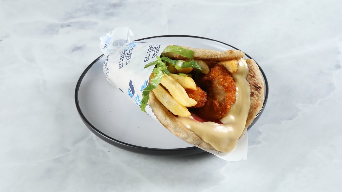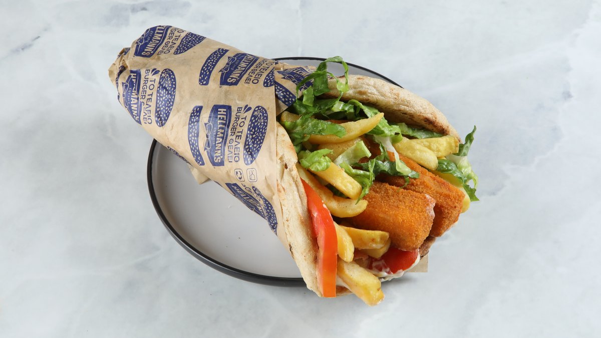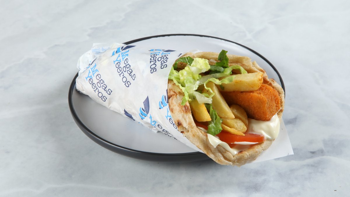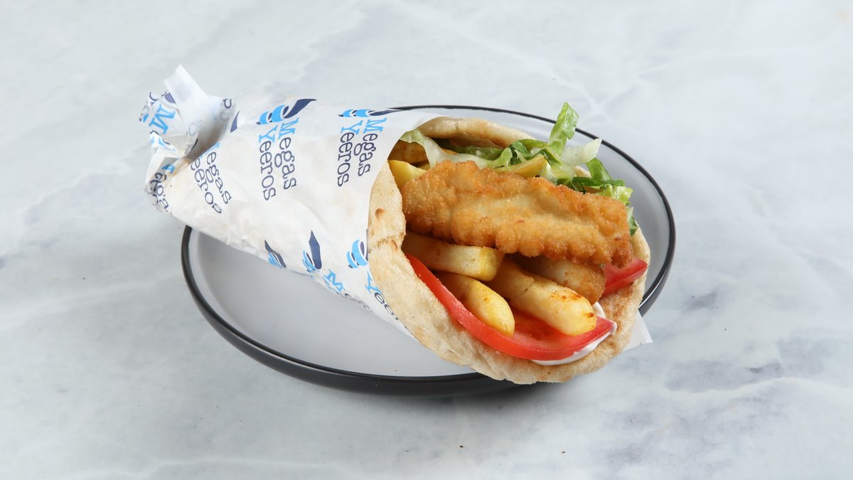 Συνοδεύεται από πατάτες τηγανητές, ντομάτα, μαρούλι, μουστάρδα, μαγιονέζα νηστίσιμη και 2 πίτες