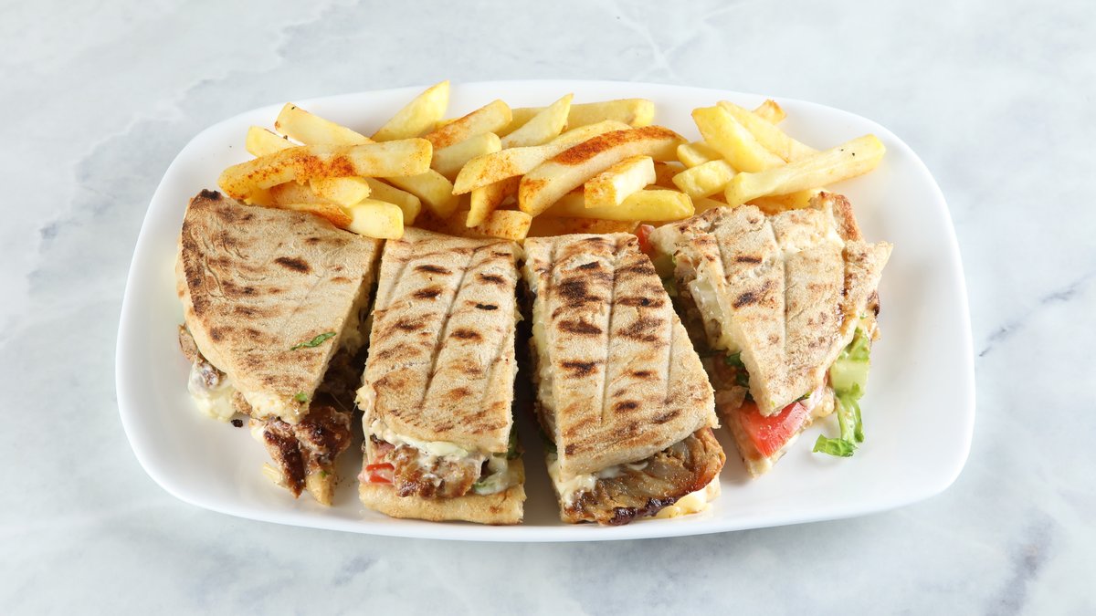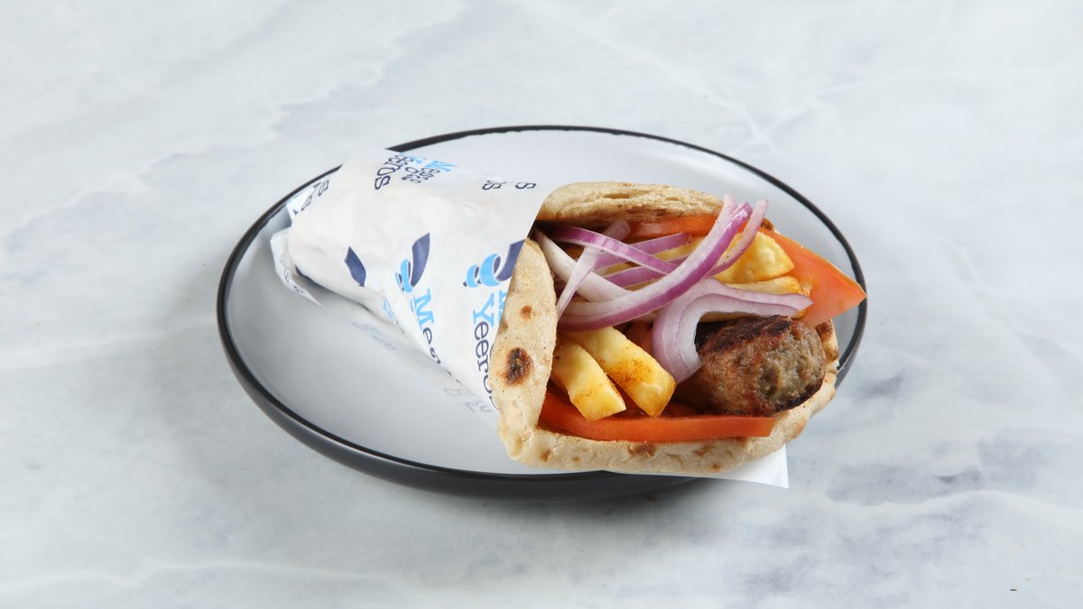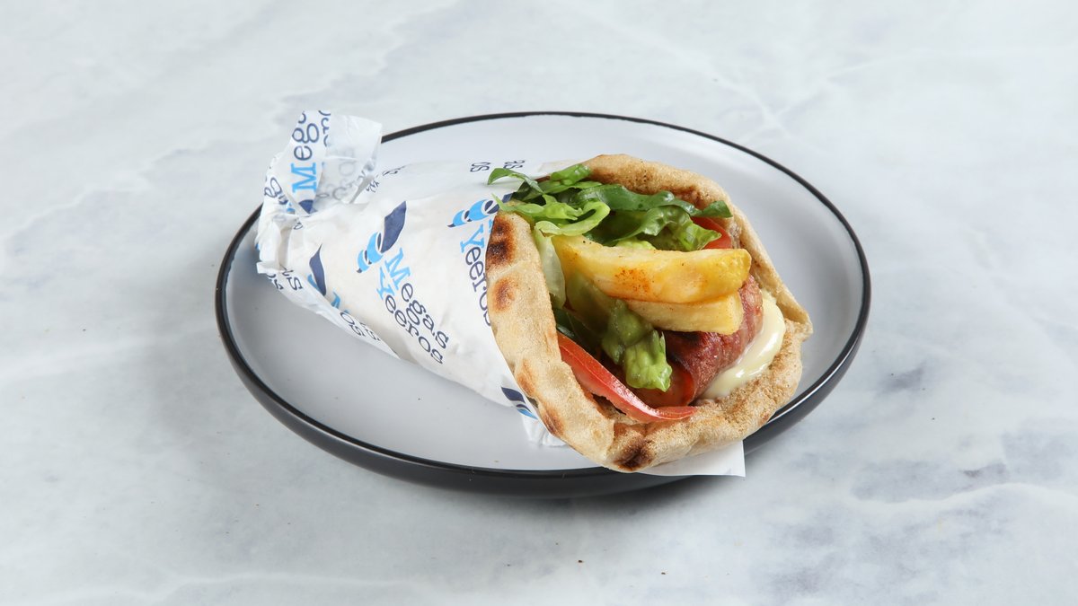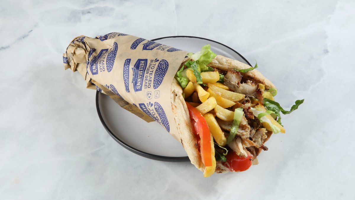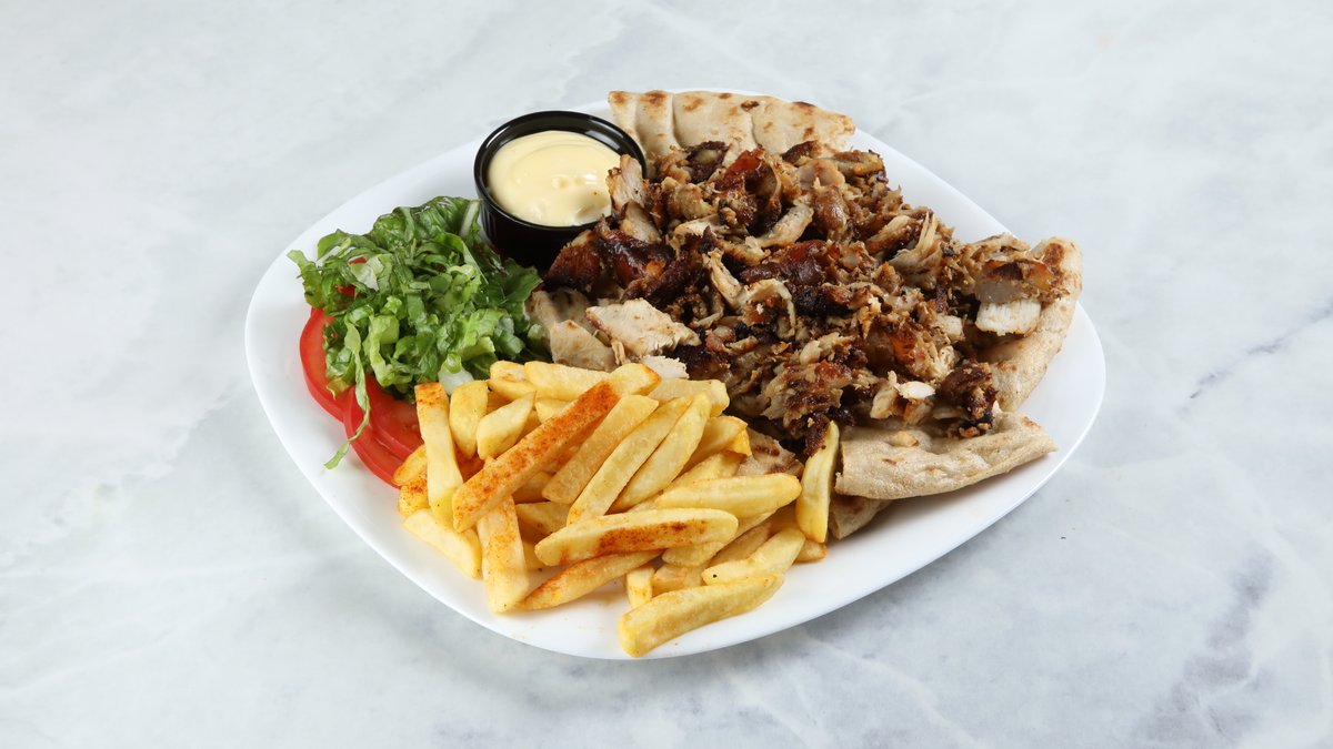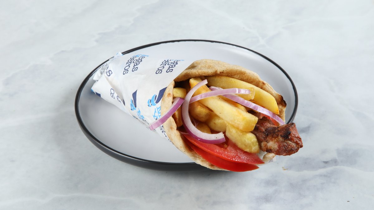 Συνοδεύεται από πατάτες τηγανητές, ντομάτα, κρεμμύδι, τζατζίκι, σάλτσα κόκκινη και 2 πίτες