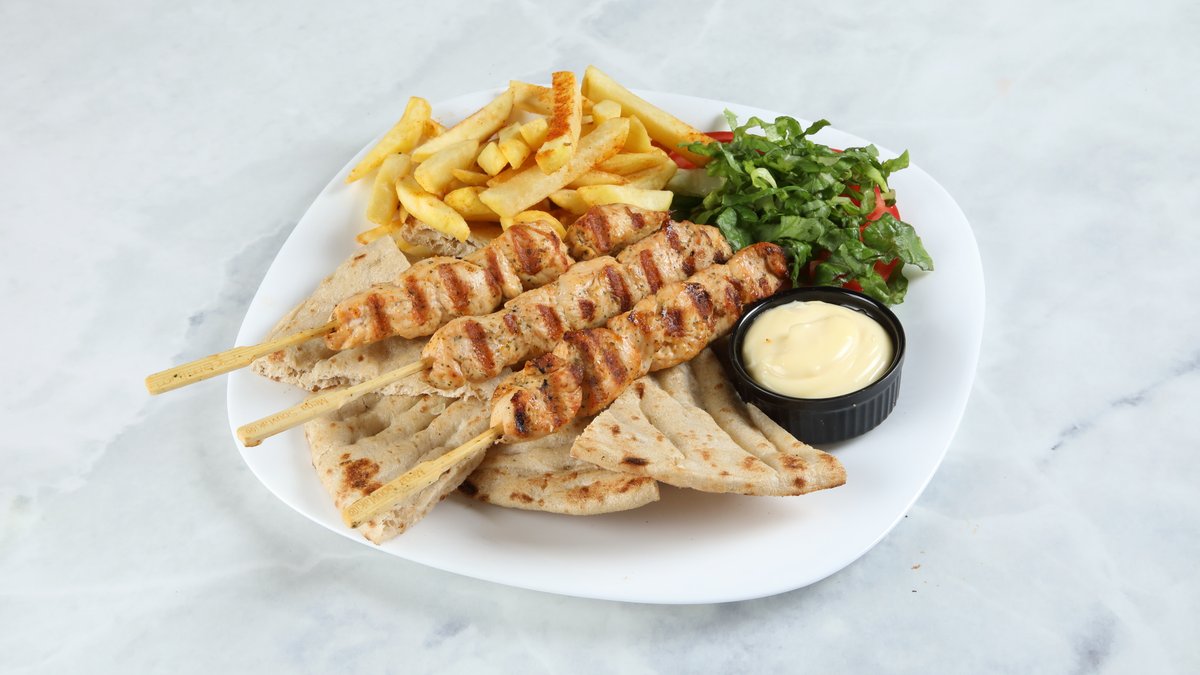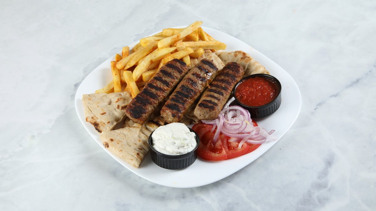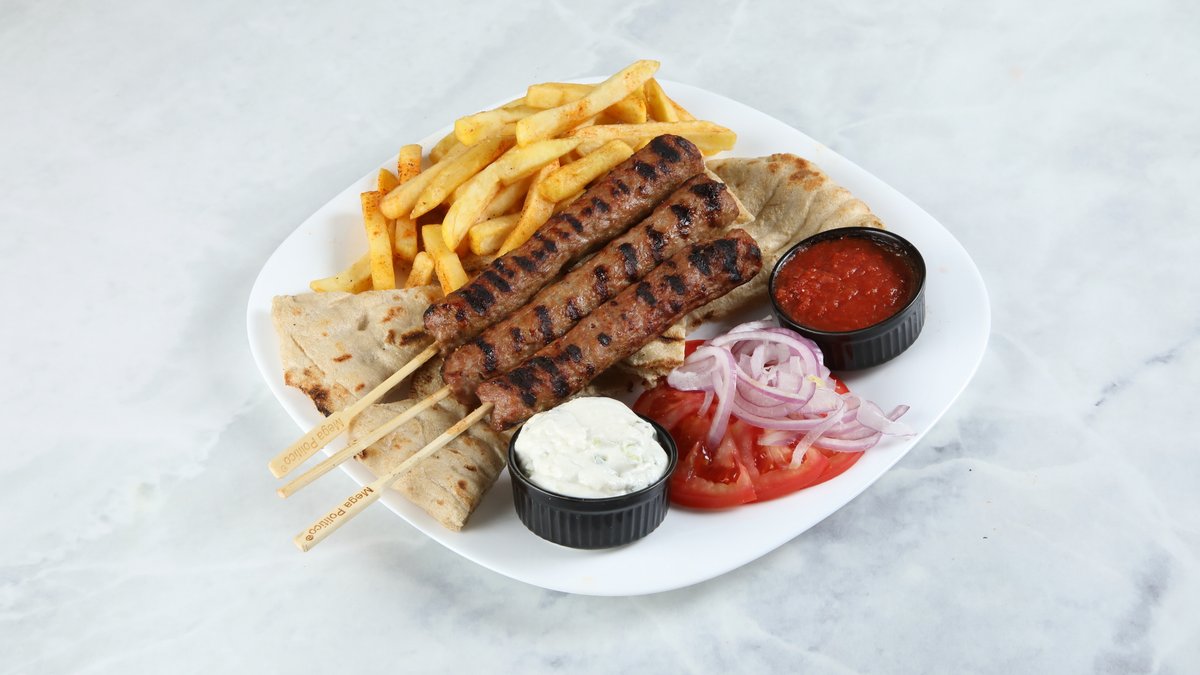 3 Τεμάχια. Συνοδεύεται από πατάτες τηγανητές, ντομάτα, κρεμμύδι, τζατζίκι, σάλτσα κόκκινη και 2 πίτες