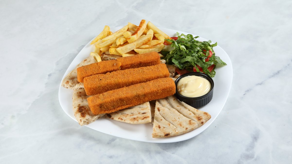 3 Τεμάχια. Συνοδεύεται από πατάτες τηγανητές, ντομάτα, μαρούλι, sauce μουστάρδας και 2 πίτες