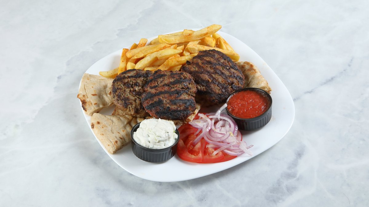 3 Τεμάχια. Χειροποίητο. Από 100% μοσχαρίσιο κιμά. Συνοδεύεται από πατάτες τηγανητές, ντομάτα, κρεμμύδι, τζατζίκι, σάλτσα κόκκινη και 2 πίτες