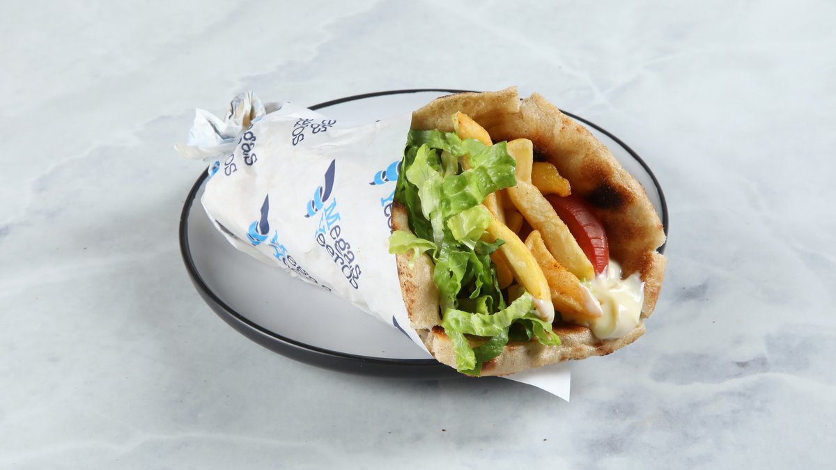 Συνοδεύεται από πατάτες τηγανητές, ντομάτα, μαρούλι, sauce μουστάρδας και 2 πίτες