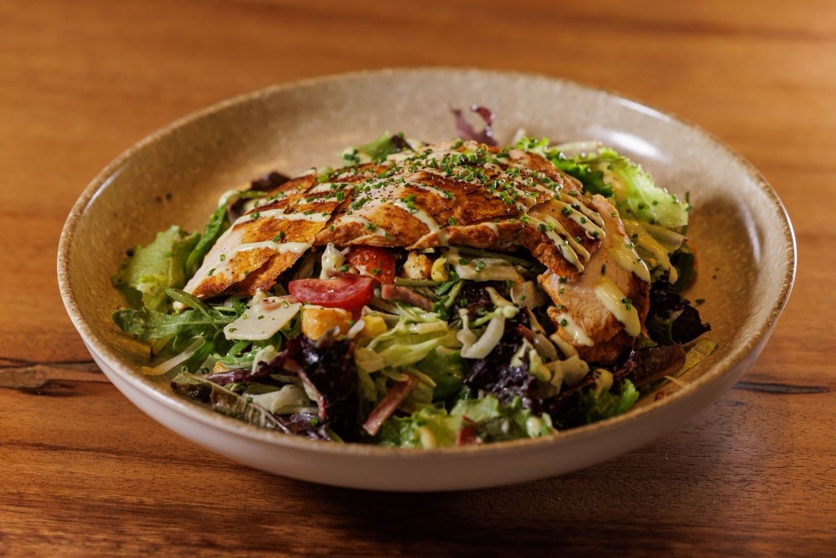 Με πράσινα φύλλα εποχής, στήθος κοτόπουλο, καπνιστό μπέικον, flakes παρμεζάνας, χειροποίητα κρουτόν και σως Καίσαρα