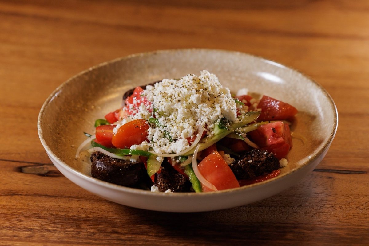 Ντομάτα, τοματίνι, αγγούρι, πιπεριές, κρεμμύδι, παξιμάδι χαρουπιού και ξινομυζήθρα