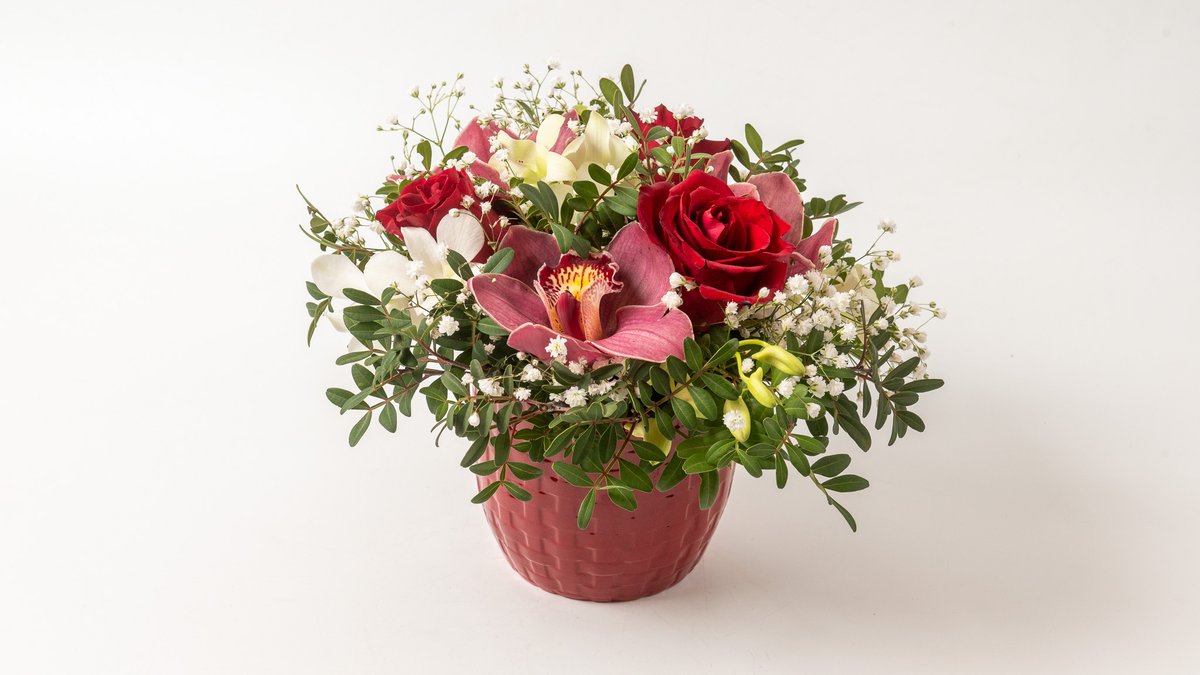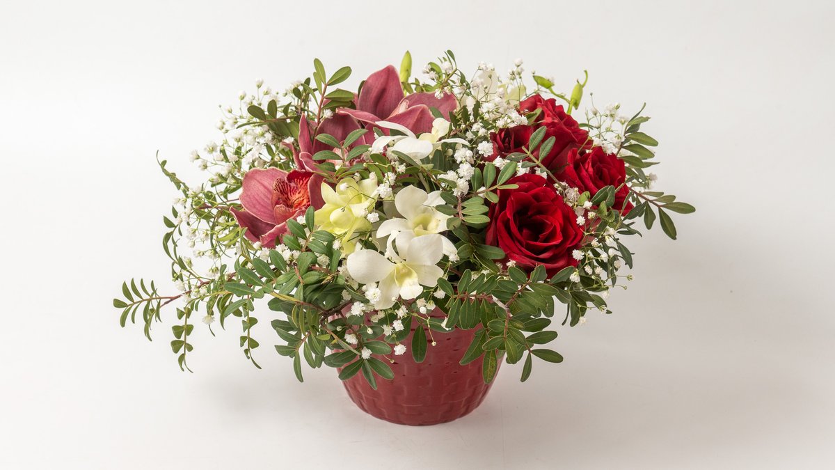 Σύνθεση Μεσαία Με Ορχιδέες, Τριαντάφυλλα σε Κασπω, σε Κόκκινες Αποχρώσεις