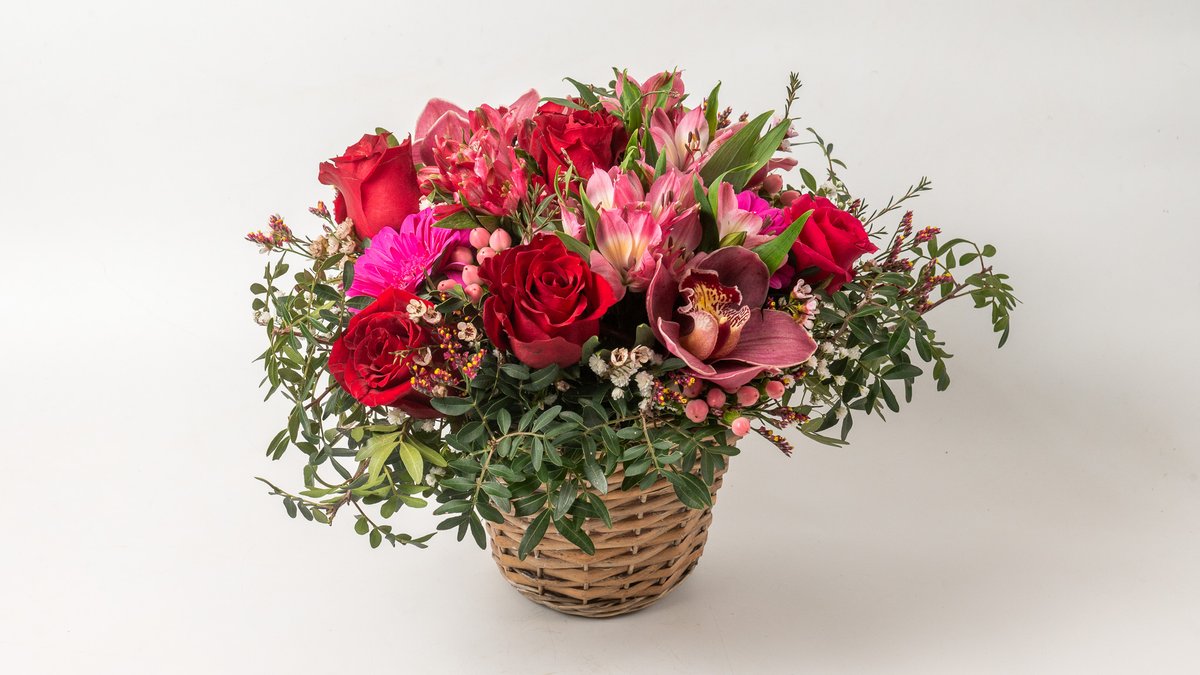 Σύνθεση με Ορχιδέες, Τριαντάφυλλα, Ζέρμπερες & Χρυσάνθεμα μεγάλη σε Καλάθι