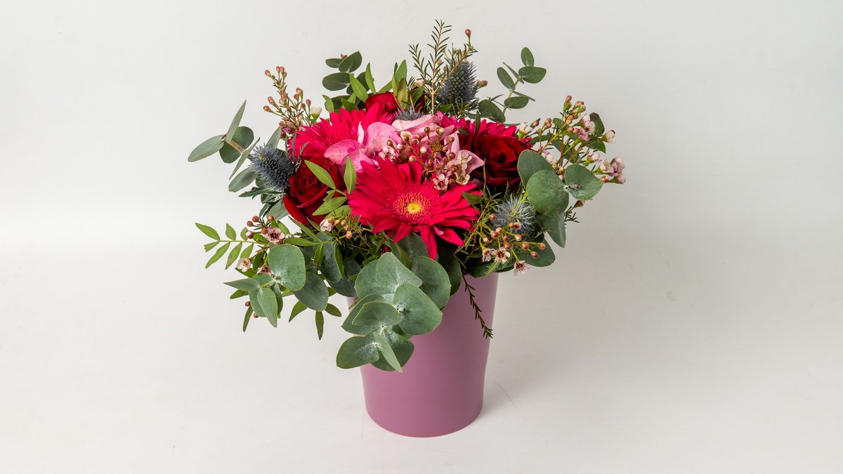 Σύνθεση με Ορχιδέες, Τριαντάφυλλα, Ζέρμπερες & Χρυσάνθεμα Μικρή σε Κασπώ