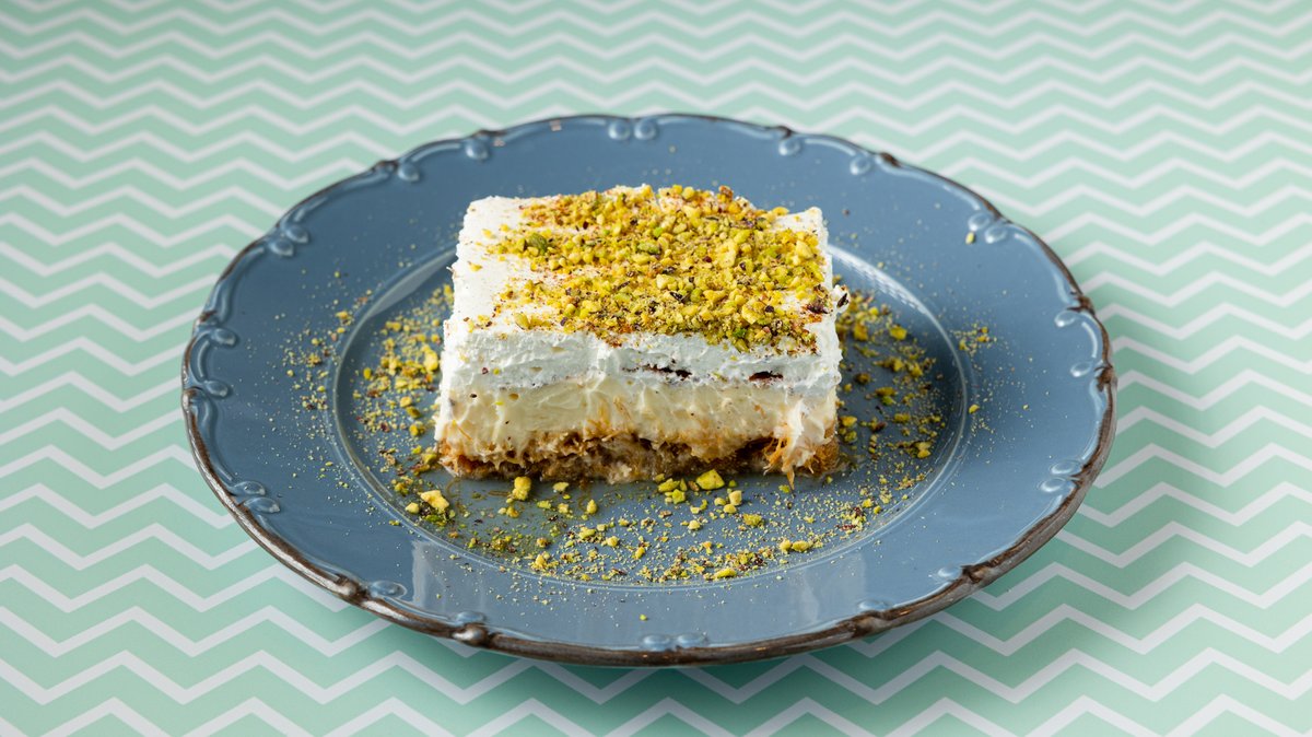 Με 2 μπάλες καϊμάκι, φυστίκι τριμμένο και σιρόπι βύσσινο
