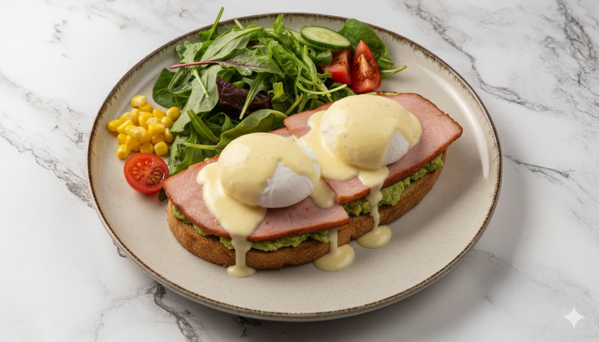 With 2 eggs, toast, ham, cherry tomatoes and hollandaise sauce