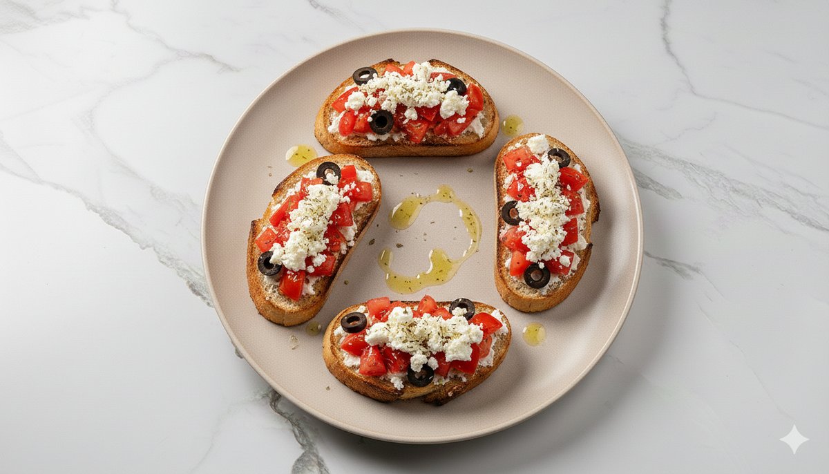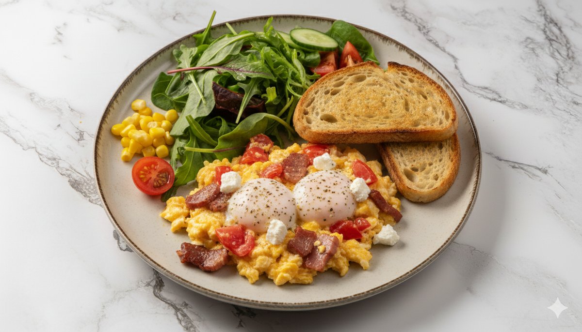 With 3 eggs, apaki, tomato, feta cheese and toasted bread