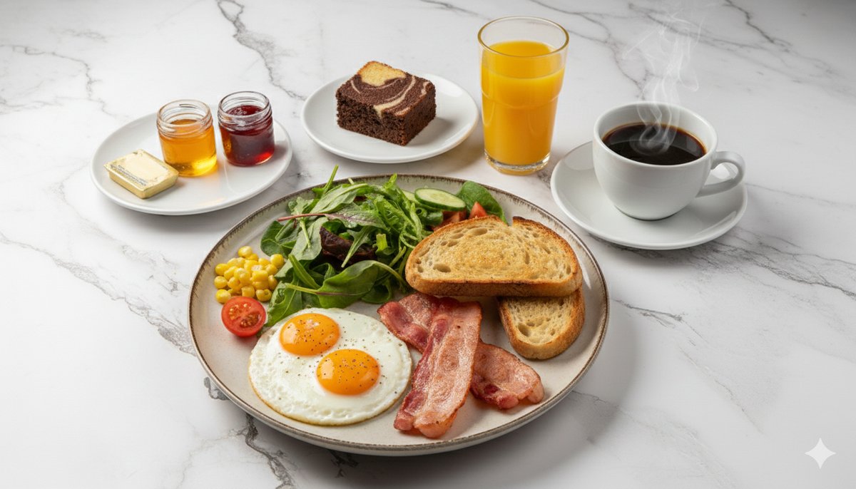 With 2 fried eggs, 2 slices of bacon, toasted bread, butter, honey, jam, cake, orange juice and 1 drink of your choice