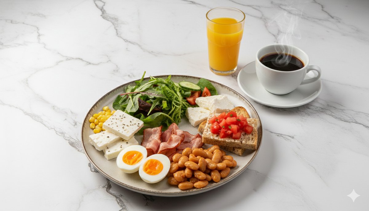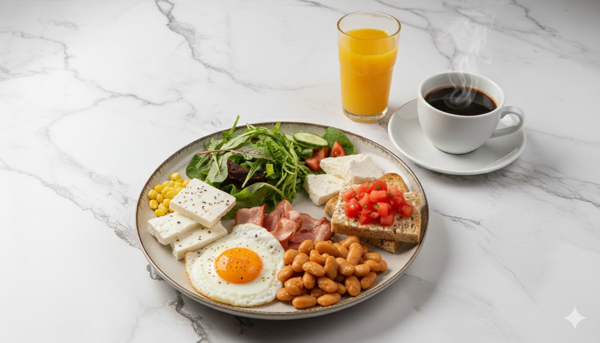 With rusk, tomato, feta cheese, 2 boiled eggs, pork chop, giant beans, orange juice and 1 drink of your choice