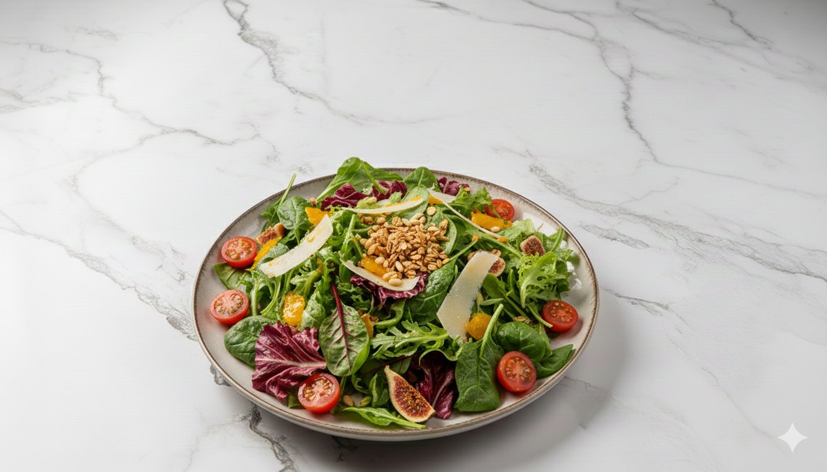 Salad with lettuce, spinach, arugula, cherry tomatoes, dried fig, pine nuts, granola cereal, parmesan and orange vinaigrette