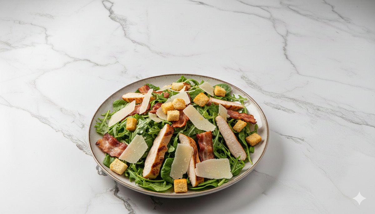 Salad with lola, chicken fillet, spinach, rocket, bacon, croutons, parmesan and Caesar's sauce