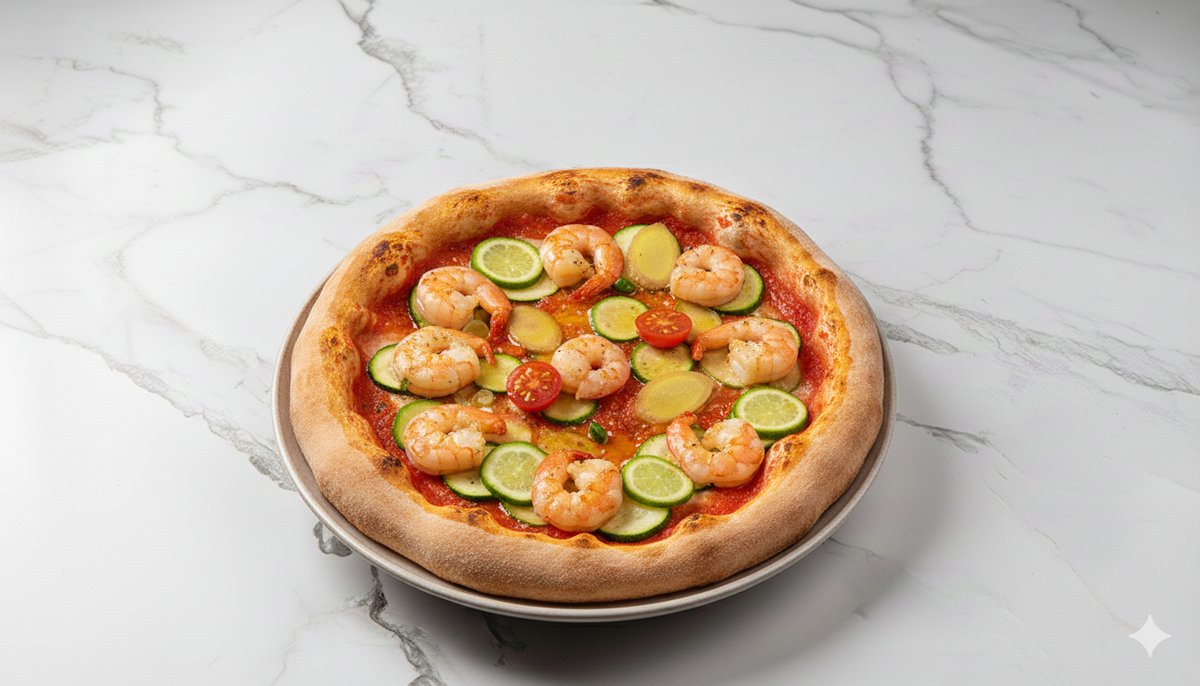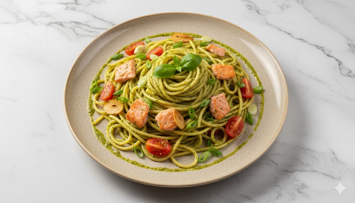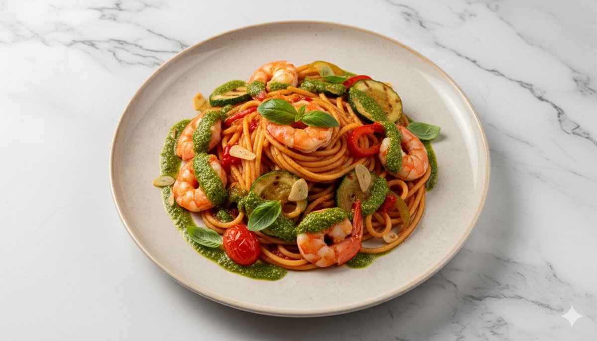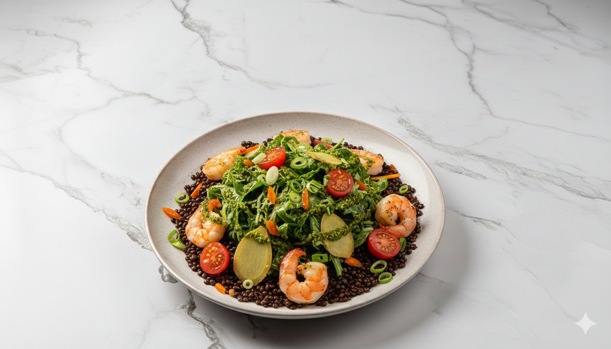 Salad with beluga lentils, shrimp, ginger, cherry tomatoes, basil pesto, fresh onion & orange vinaigrette